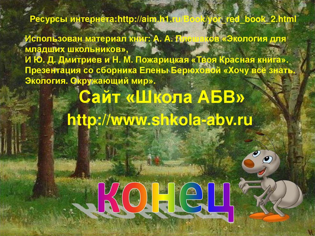 Ресурсы интернета:http://aim.h1.ru/Book/yor_red_book_2.htmlИспользован материал книг: А. А. Плешаков «Экология для