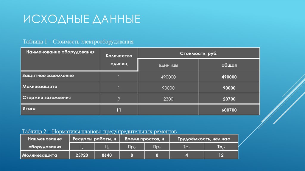 ИСХОДНЫЕ ДАННЫЕТаблица 1 – Стоимость электрооборудования