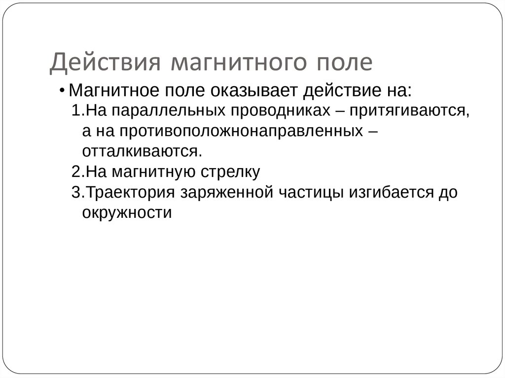 Действия магнитного поле• Магнитное поле оказывает действие на: