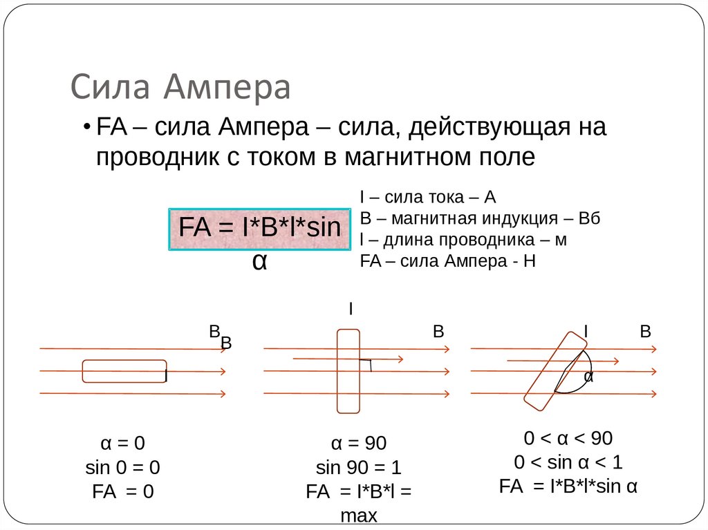Сила Ампера• FA – сила Ампера – сила, действующая на