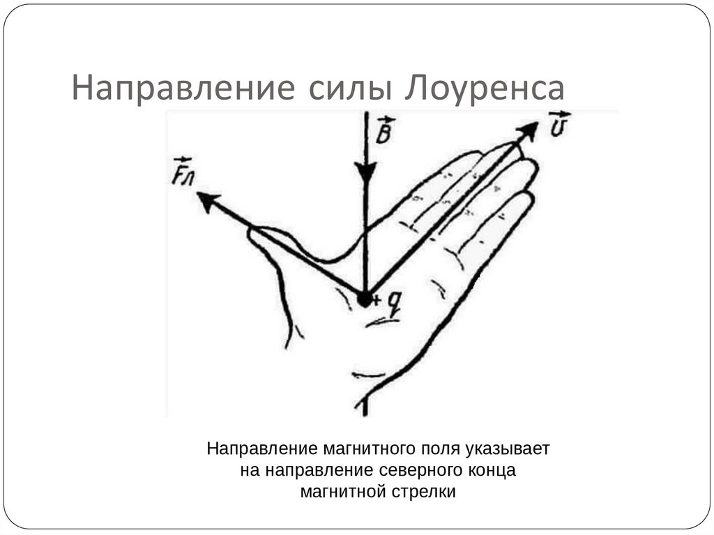 Направление силы ЛоуренсаНаправление магнитного поля указывает