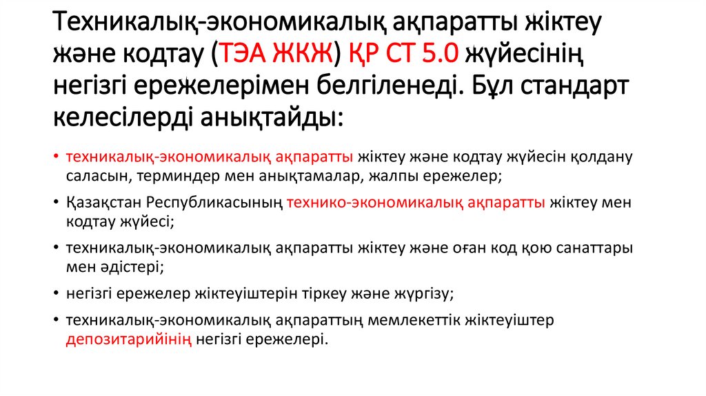 2. Техникалық-экономикалық ақпаратты жіктеу және кодтау (ТЭА ЖКЖ) ҚР СТ 5.0 жүйесінің негізгі ережелерімен белгіленеді. Бұл