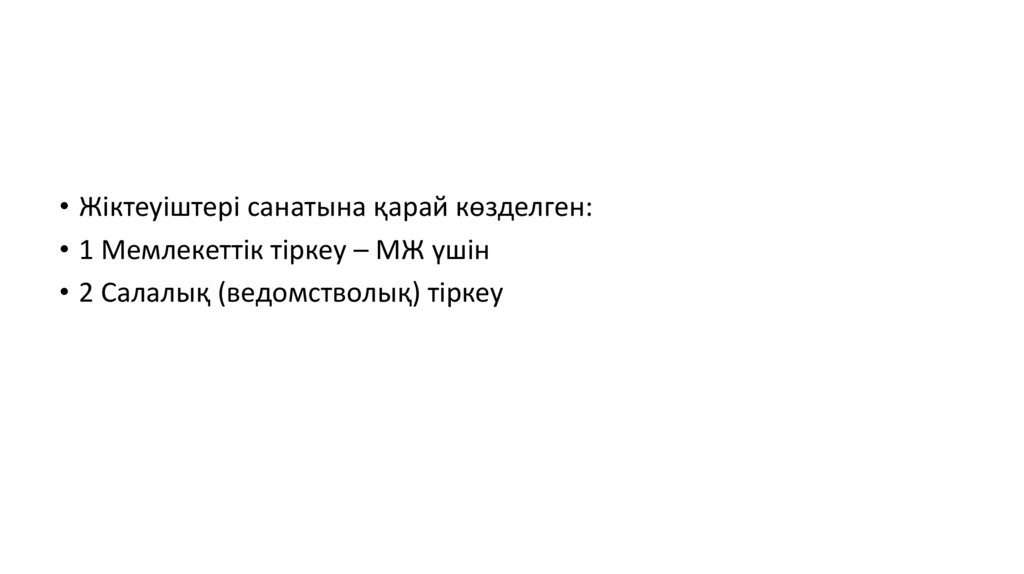 • Жіктеуіштері санатына қарай көзделген:• 1 Мемлекеттік тіркеу – МЖ үшін