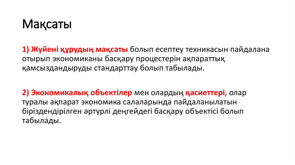 1) Жүйені құрудың мақсаты болып есептеу техникасын пайдаланаотырып экономиканы басқару процестерін ақпараттық