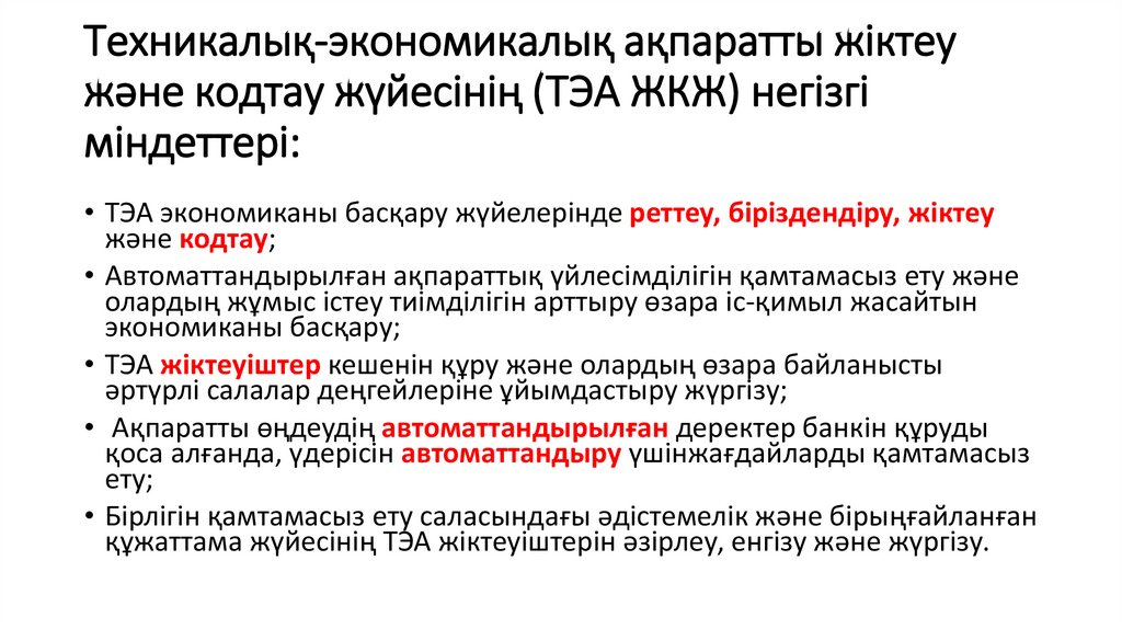 4. Техникалық-экономикалық ақпаратты жіктеу және кодтау жүйесінің (ТЭА ЖКЖ) негізгі міндеттері: