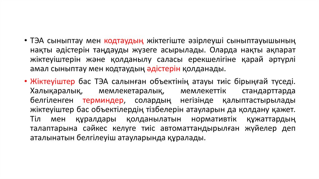 • ТЭА сыныптау мен кодтаудың жіктегіште әзірлеуші сыныптауышыныңнақты әдістерін таңдауды жүзеге асырылады. Оларда нақты ақпарат