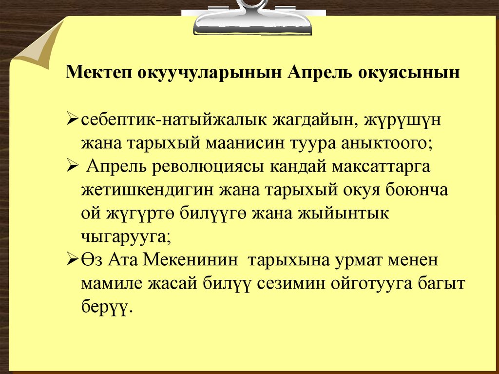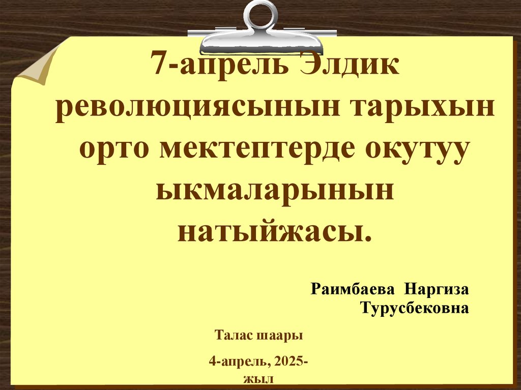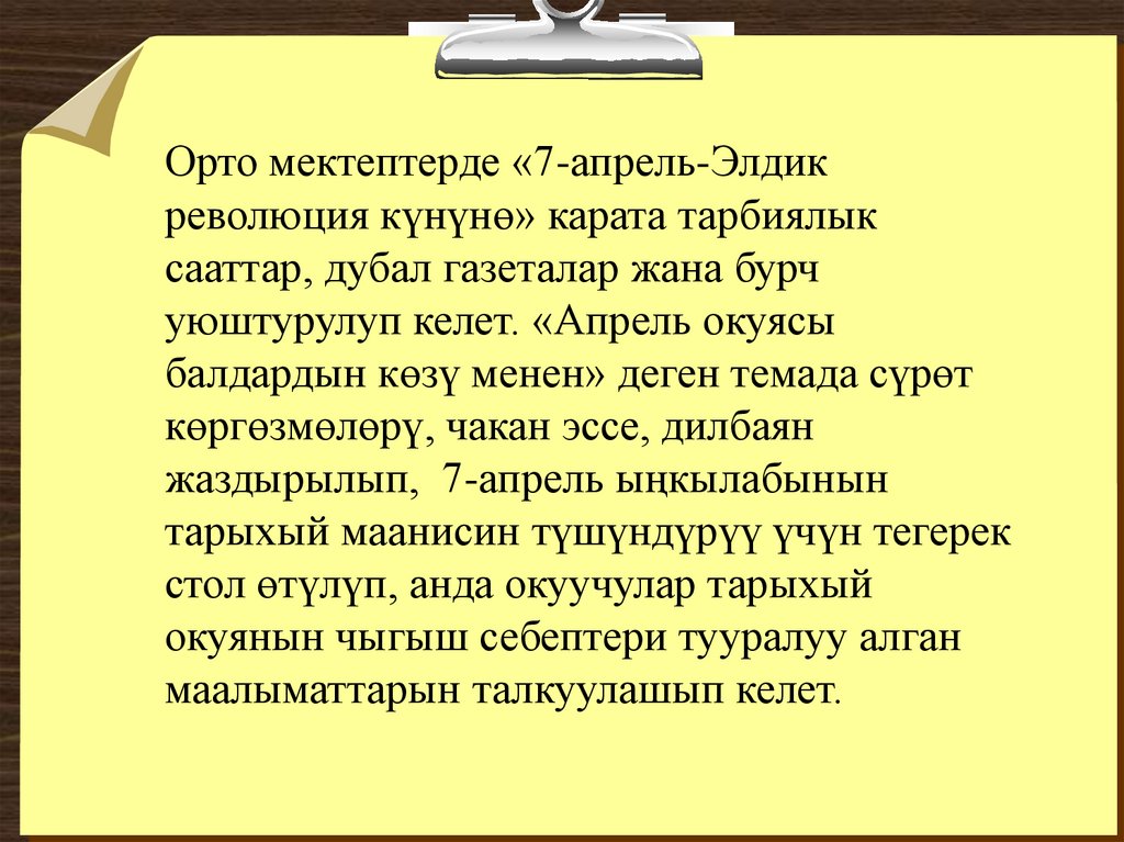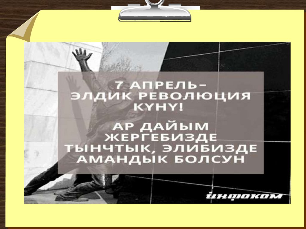 1. 7-апрель Элдик революциясынын тарыхын орто мектептерде окутуу ыкмаларынын натыйжасы.