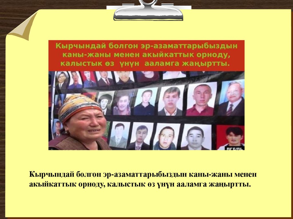 Кырчындай болгон эр-азаматтарыбыздын каны-жаны мененакыйкаттык орноду, калыстык өз үнүн ааламга жаңыртты.