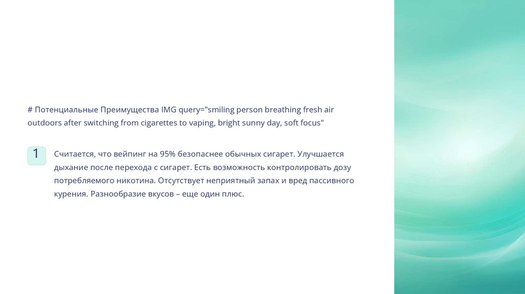 # Потенциальные Преимущества IMG query="smiling person breathing fresh airoutdoors after switching from cigarettes to vaping, bright sunny day, soft focus"