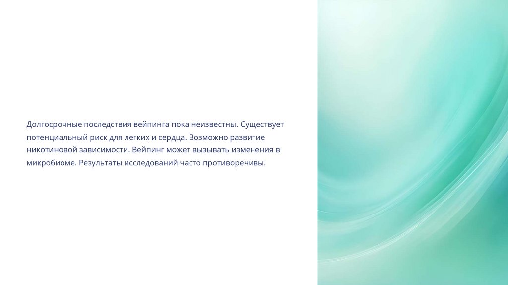 Долгосрочные последствия вейпинга пока неизвестны. Существуетпотенциальный риск для легких и сердца. Возможно развитие
