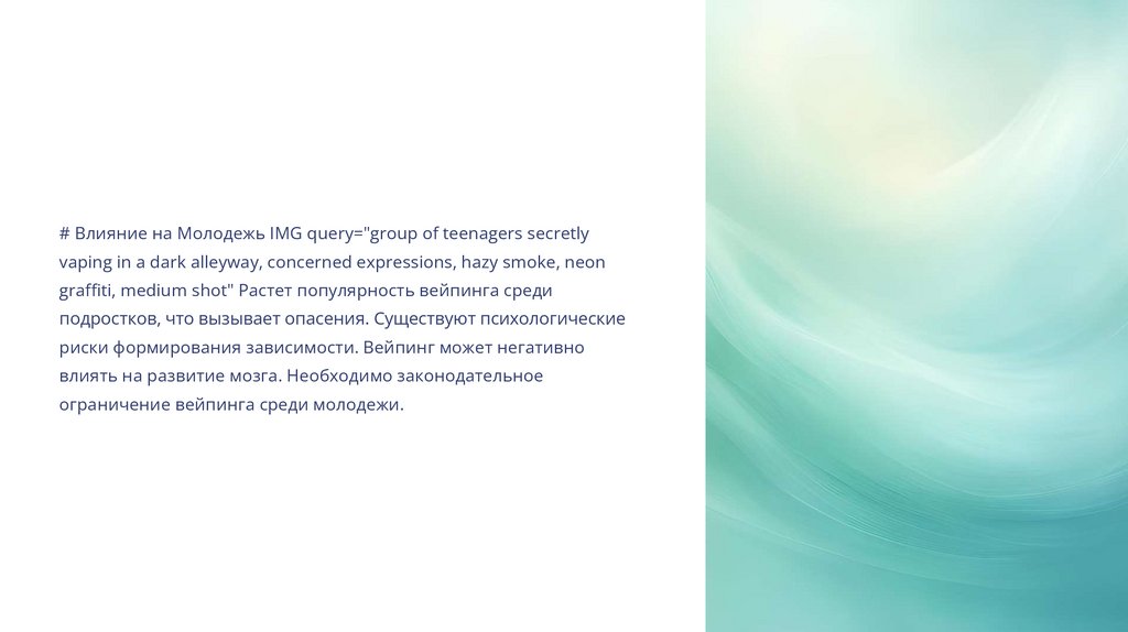 # Влияние на Молодежь IMG query="group of teenagers secretlyvaping in a dark alleyway, concerned expressions, hazy smoke, neon