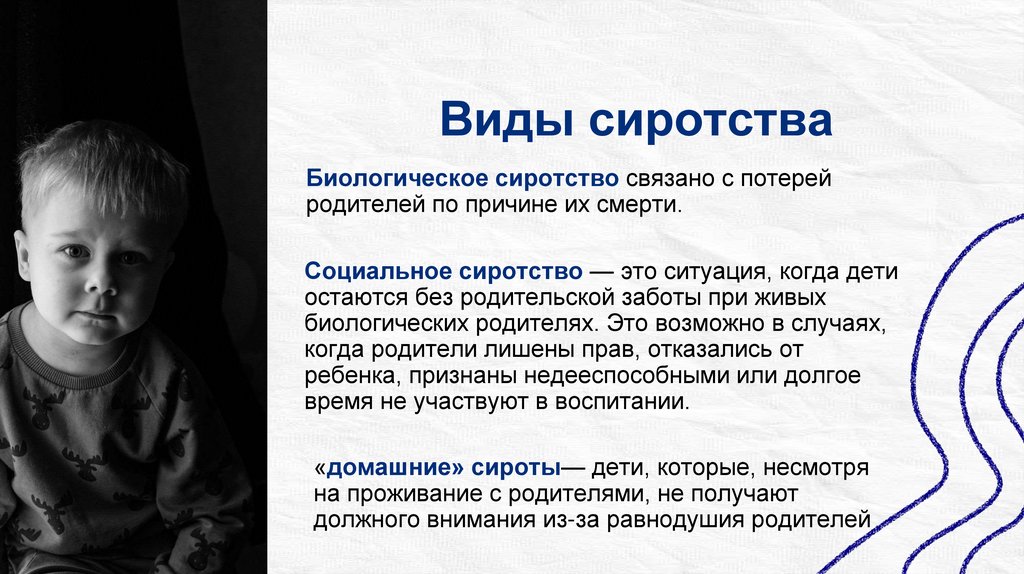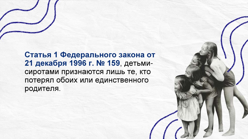 Статья 1 Федерального закона от21 декабря 1996 г. № 159, детьмисиротами признаются лишь те, кто