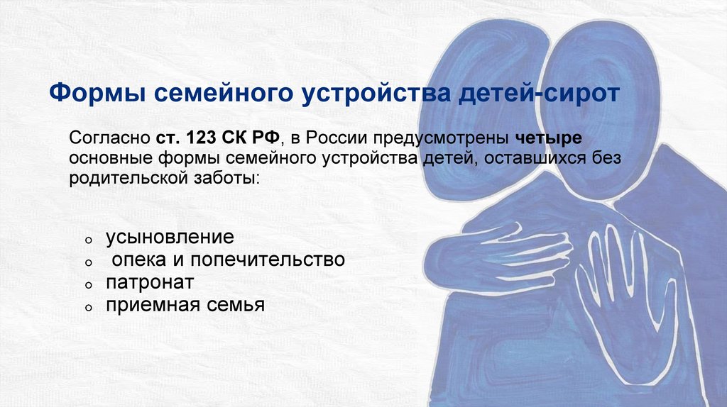 Формы семейного устройства детей-сиротСогласно ст. 123 СК РФ, в России предусмотрены четыре