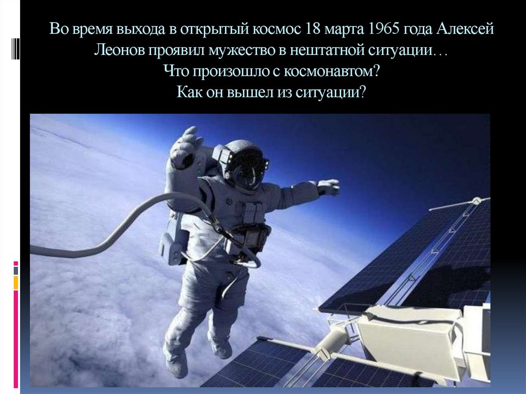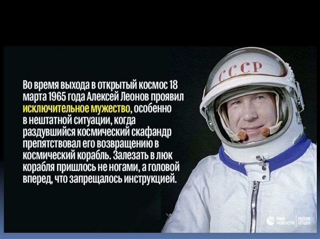 Во время выхода в открытый космос 18 марта 1965 года АлексейЛеонов проявил мужество в нештатной ситуации…