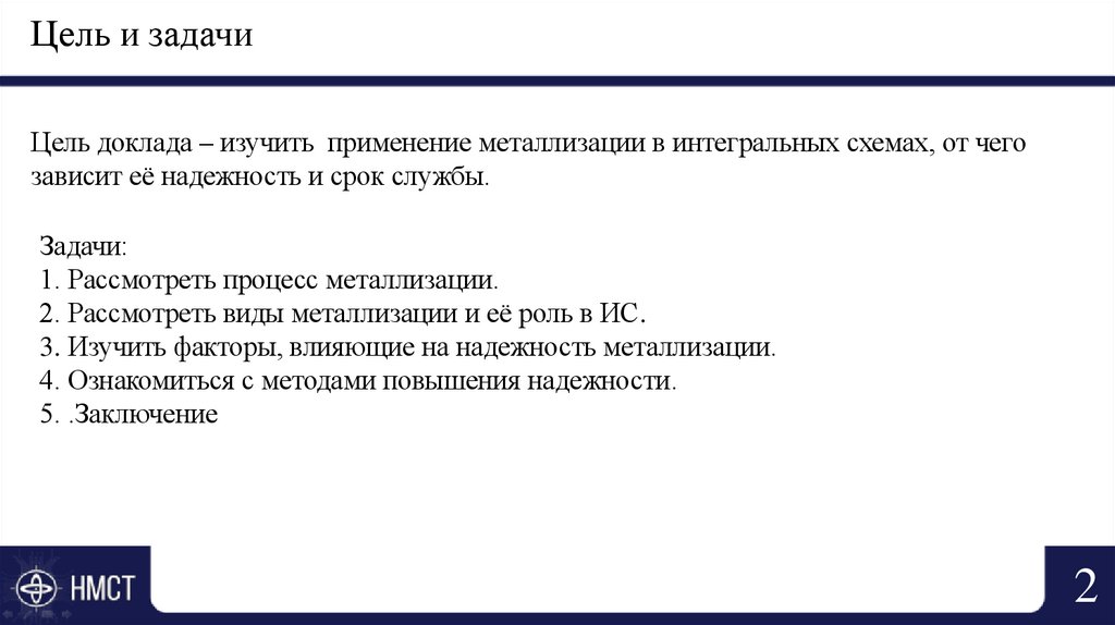 Цель и задачиЦель доклада – изучить применение металлизации в интегральных схемах, от чего