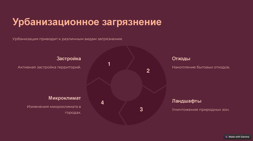Урбанизационное загрязнениеУрбанизация приводит к различным видам загрязнения.