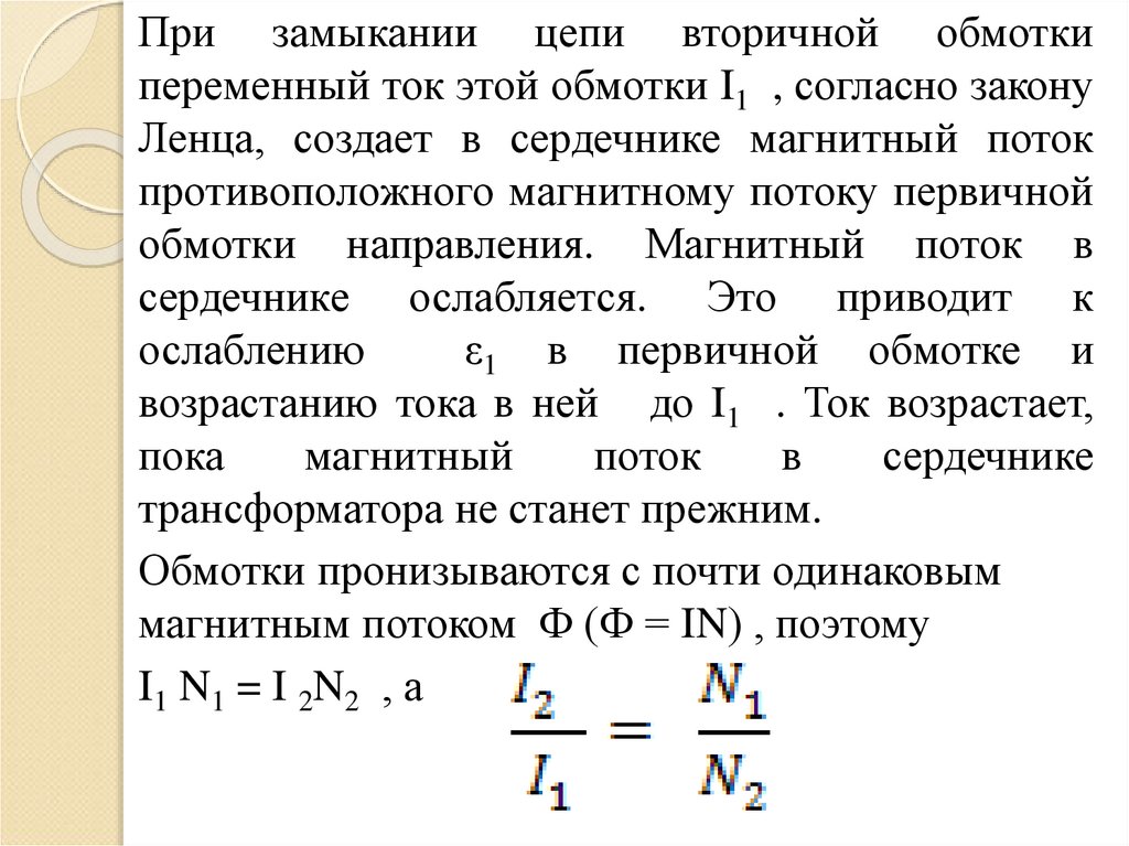 При замыкании цепи вторичной обмоткипеременный ток этой обмотки I1 , согласно закону