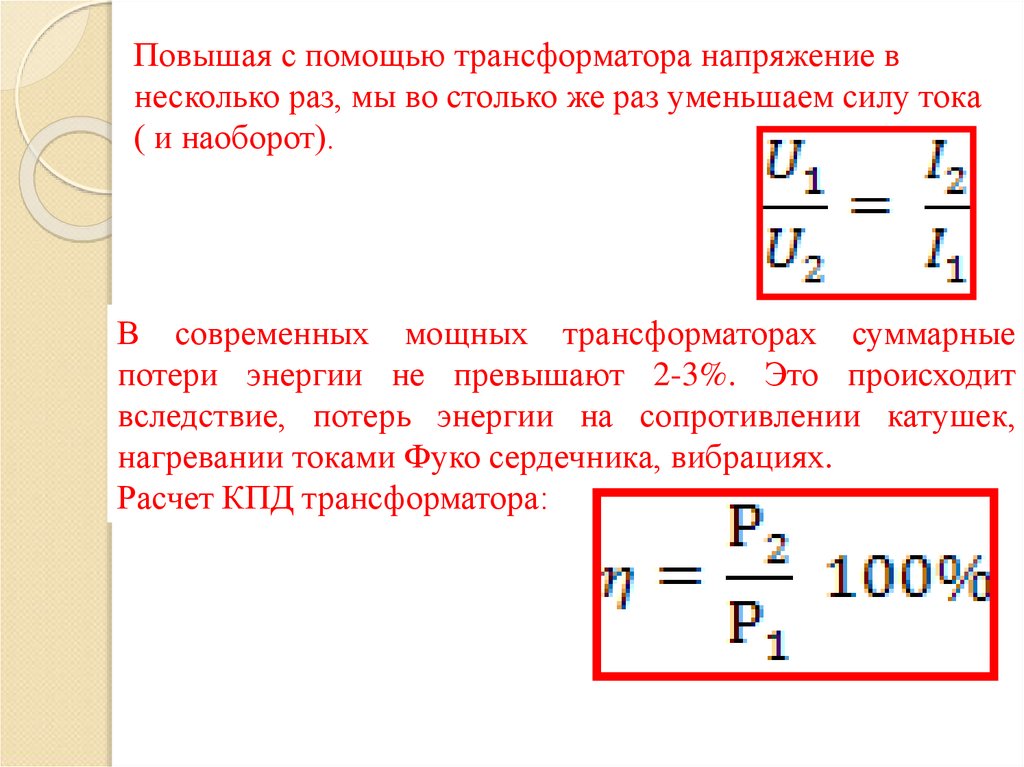 Повышая с помощью трансформатора напряжение внесколько раз, мы во столько же раз уменьшаем силу тока