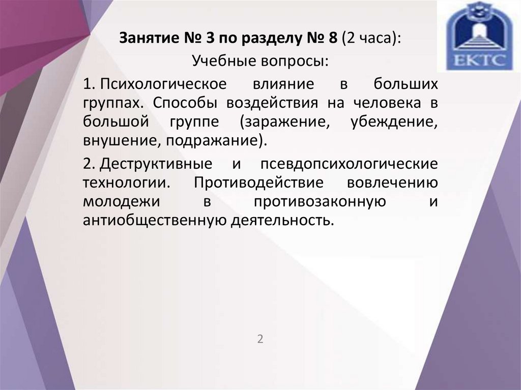 Занятие № 3 по разделу № 8 (2 часа):Учебные вопросы: