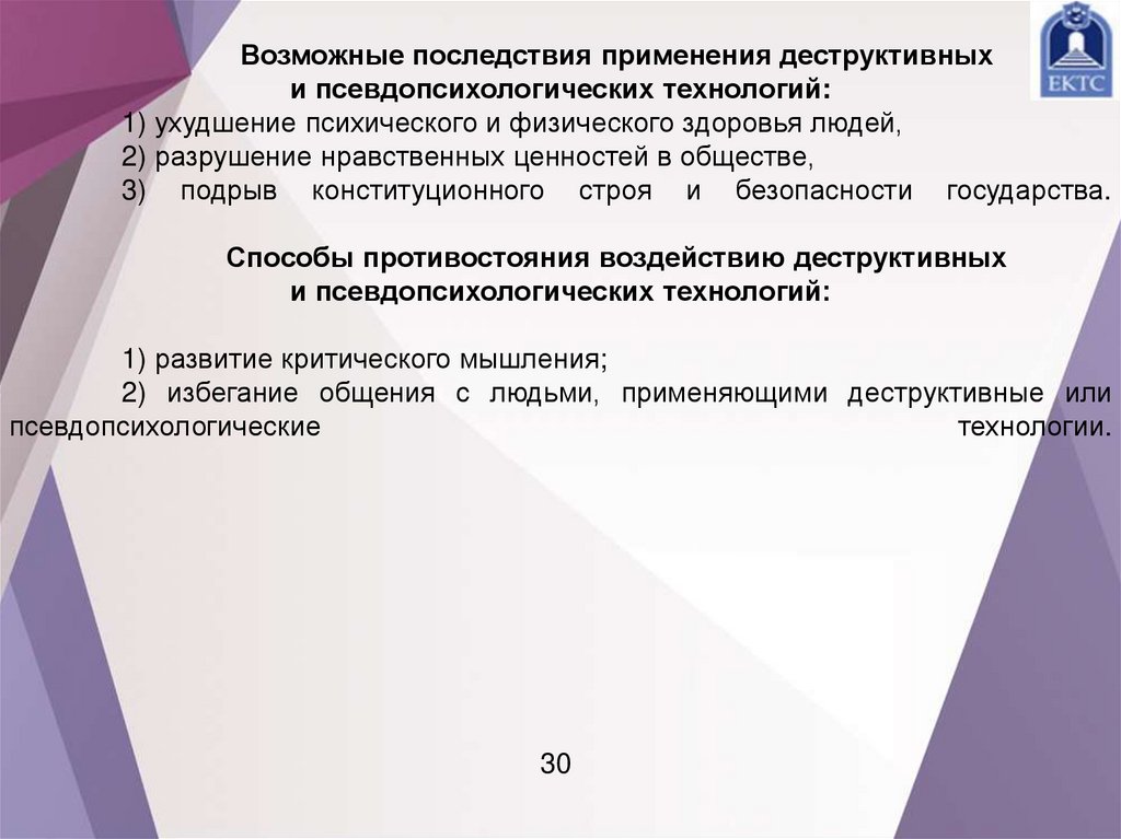 Возможные последствия применения деструктивныхи псевдопсихологических технологий: