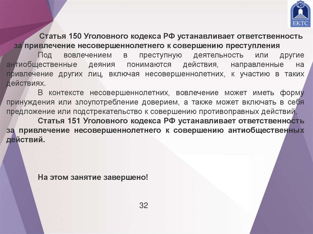 Статья 150 Уголовного кодекса РФ устанавливает ответственностьза привлечение несовершеннолетнего к совершению преступления