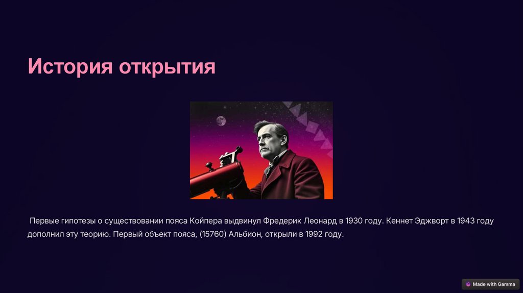 История открытияПервые гипотезы о существовании пояса Койпера выдвинул Фредерик Леонард в 1930 году. Кеннет Эджворт в 1943 году