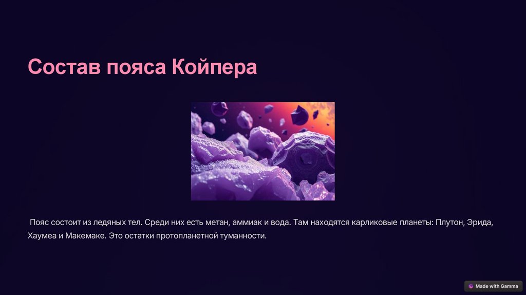 Состав пояса КойпераПояс состоит из ледяных тел. Среди них есть метан, аммиак и вода. Там находятся карликовые планеты: Плутон, Эрида,