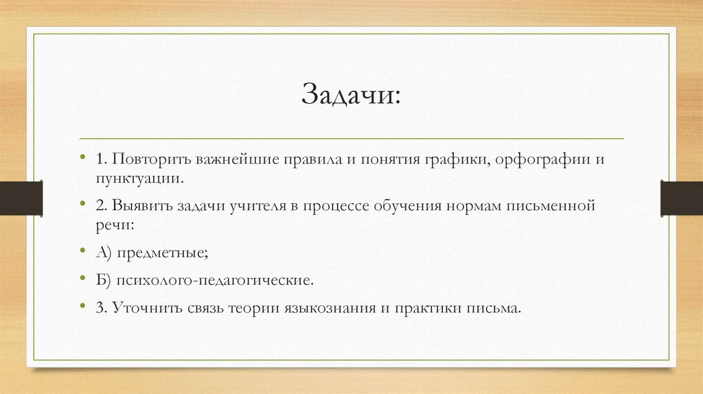 • 2. Выявить задачи учителя в процессе обучения нормам письменной