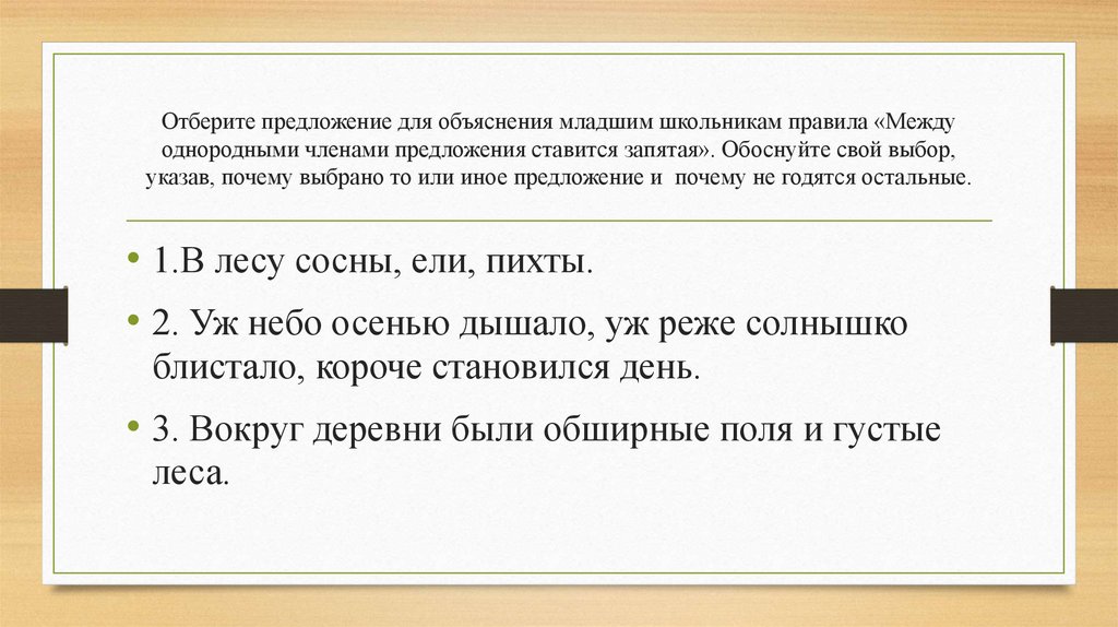 20. Отберите предложение для объяснения младшим школьникам правила «Между однородными членами предложения ставится запятая».