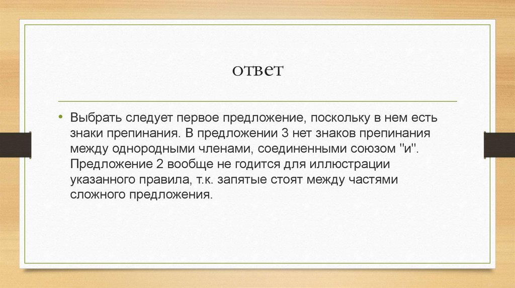 • Выбрать следует первое предложение, поскольку в нем естьзнаки препинания. В предложении 3 нет знаков препинания