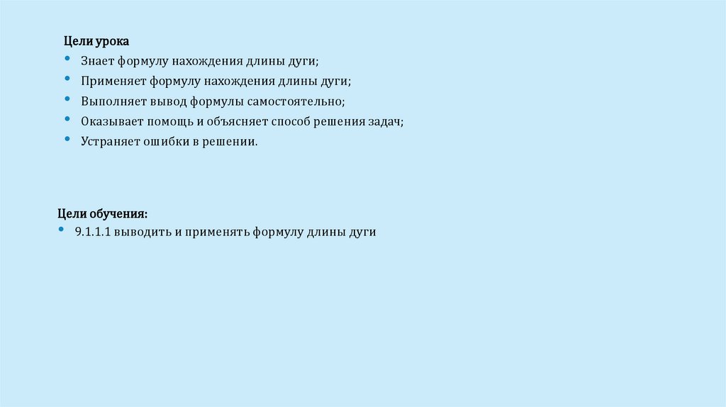 Цели урока• Знает формулу нахождения длины дуги;
