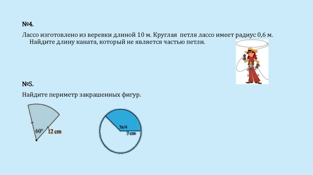 №4.Лассо изготовлено из веревки длиной 10 м. Круглая петля лассо имеет радиус 0,6 м.