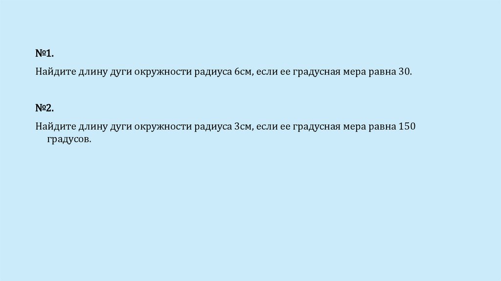 №1.Найдите длину дуги окружности радиуса 6см, если ее градусная мера равна 30.
