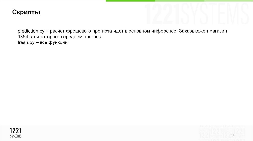 Скриптыprediction.py – расчет фрешевого прогноза идет в основном инференсе. Захардкожен магазин