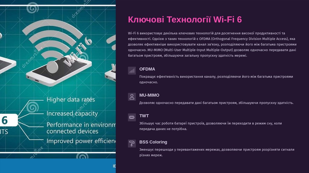 Ключові Технології Wi-Fi 6Wi-Fi 6 використовує декілька ключових технологій для досягнення високої продуктивності та