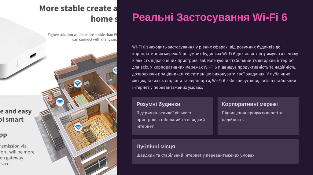 корпоративних мереж. У розумних будинках Wi-Fi 6 дозволяє підтримувати велику