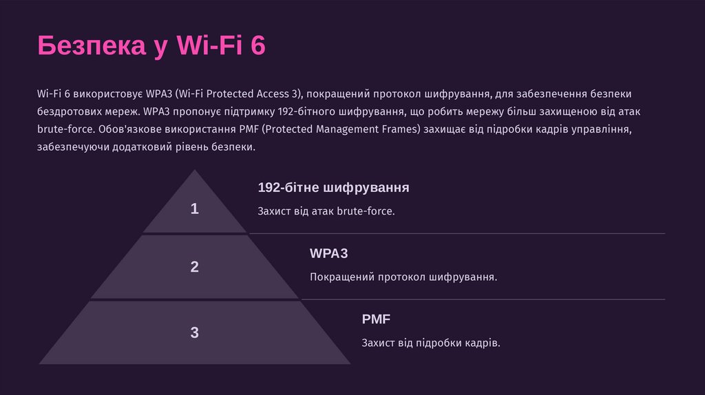 бездротових мереж. WPA3 пропонує підтримку 192-бітного шифрування, що робить мережу більш захищеною від атак
