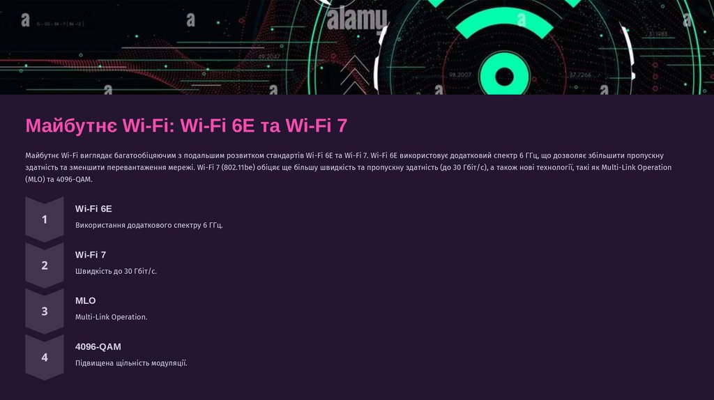 Майбутнє Wi-Fi: Wi-Fi 6E та Wi-Fi 7Майбутнє Wi-Fi виглядає багатообіцяючим з подальшим розвитком стандартів Wi-Fi 6E та Wi-Fi 7. Wi-Fi 6E використовує додатковий спектр 6 ГГц, що дозволяє збільшити пропускну