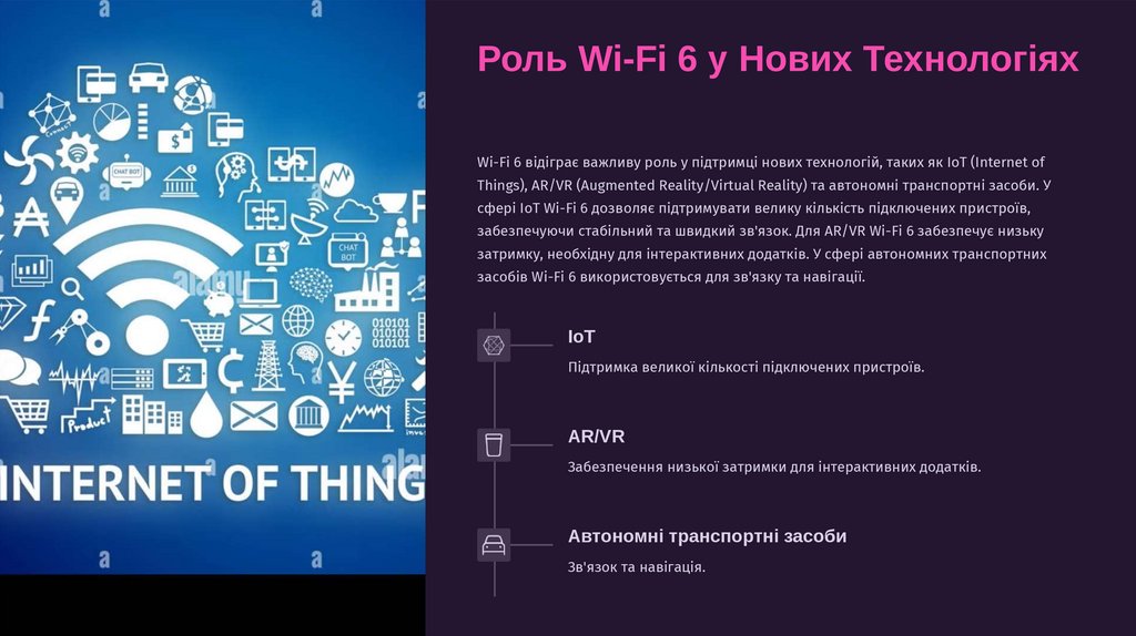 Роль Wi-Fi 6 у Нових ТехнологіяхWi-Fi 6 відіграє важливу роль у підтримці нових технологій, таких як IoT (Internet of