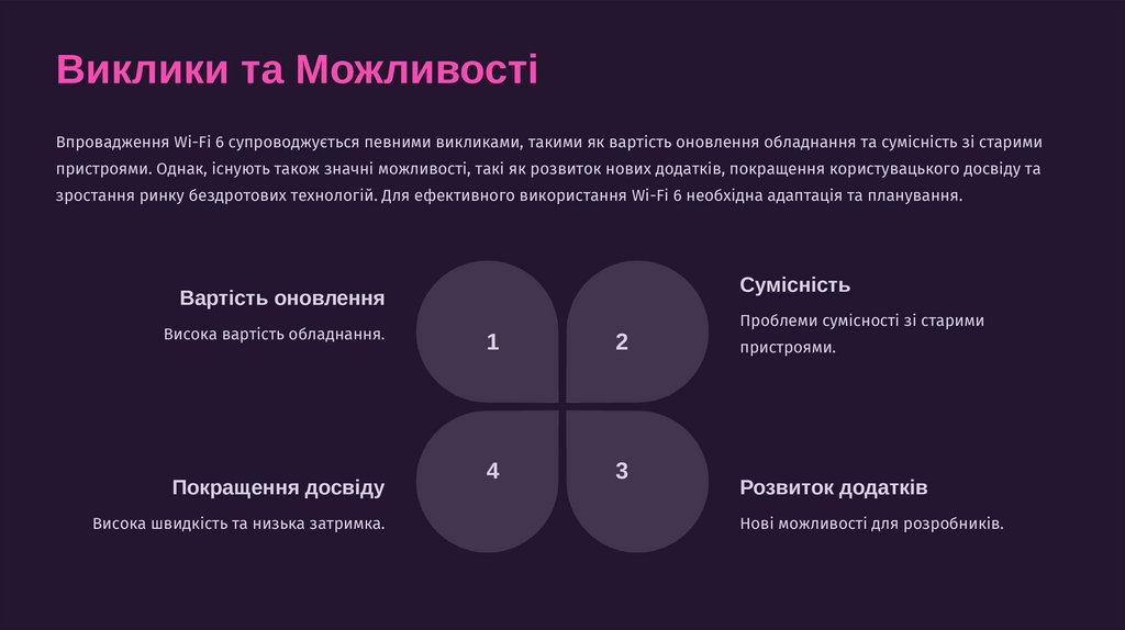 Виклики та МожливостіВпровадження Wi-Fi 6 супроводжується певними викликами, такими як вартість оновлення обладнання та сумісність зі старими