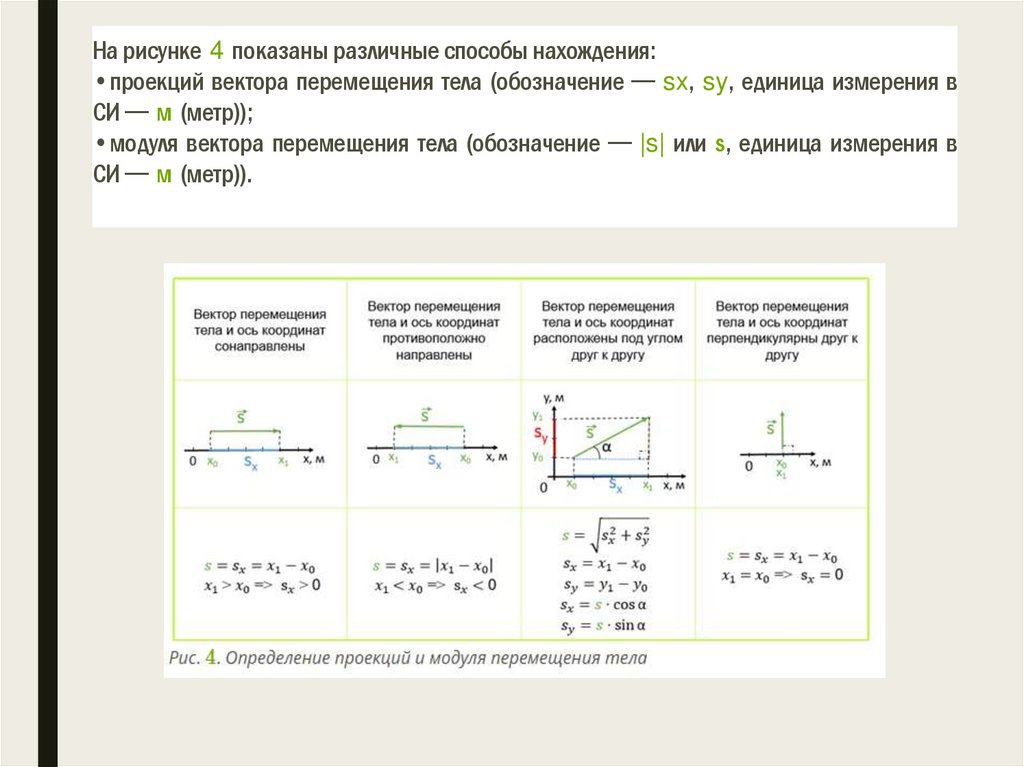 На рисунке 4 показаны различные способы нахождения:•проекций вектора перемещения тела (обозначение — sx, sy, единица измерения в