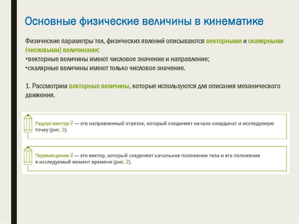 Основные физические величины в кинематикеФизические параметры тел, физических явлений описываются векторными и скалярными