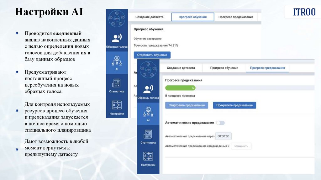 Примеры голосов загружаются в виде архива. Обучение и предсказание AI выполняются по расписанию.