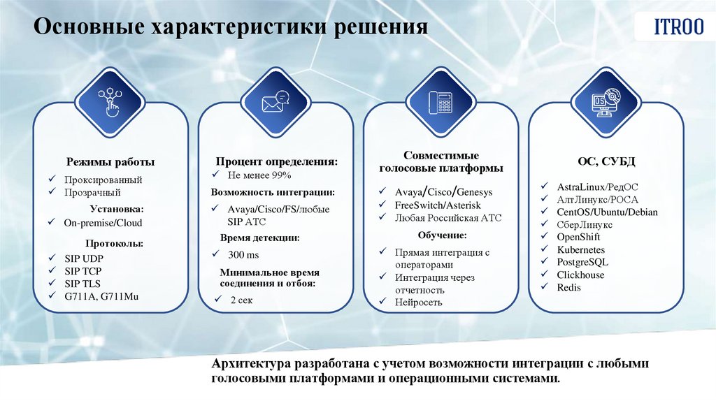 соответствующей реакцией (сброс вызова, перевод на оператора, выставление другого SIPкода). Поддерживаются любые модификации SIP-обмена и возможность выставления любого