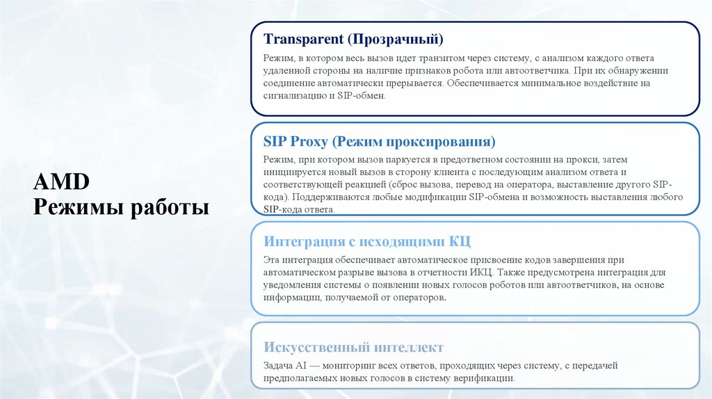 Transparent (Прозрачный)Режим, в котором весь вызов идет транзитом через систему, с анализом каждого ответа