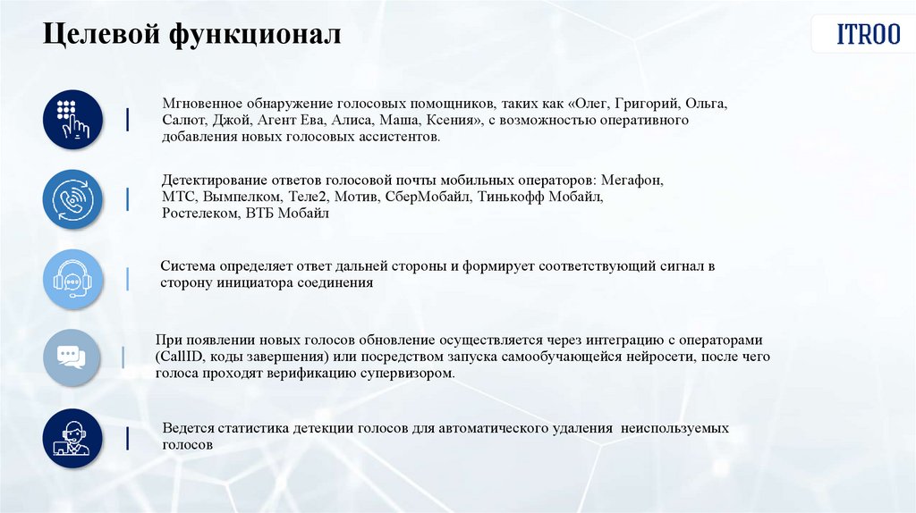 Целевой функционалМгновенное обнаружение голосовых помощников, таких как «Олег, Григорий, Ольга,