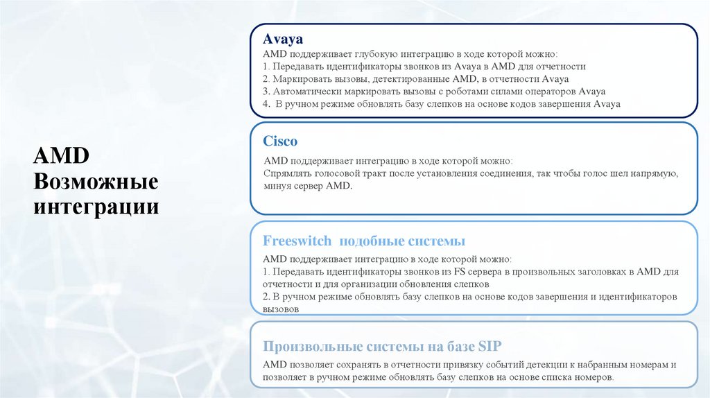 AvayaAMD поддерживает глубокую интеграцию в ходе которой можно: