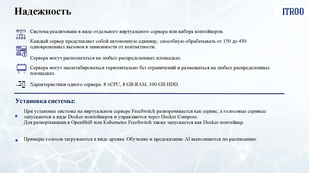 НадежностьСистема реализована в виде отдельного виртуального сервера или набора контейнеров.