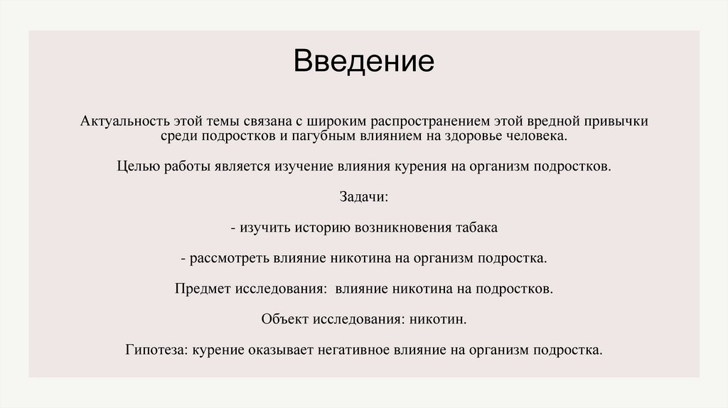 Гипотеза: курение оказывает негативное влияние на организм подростка.
