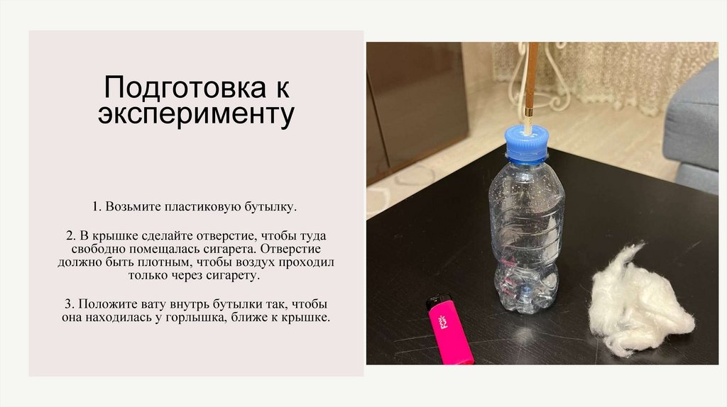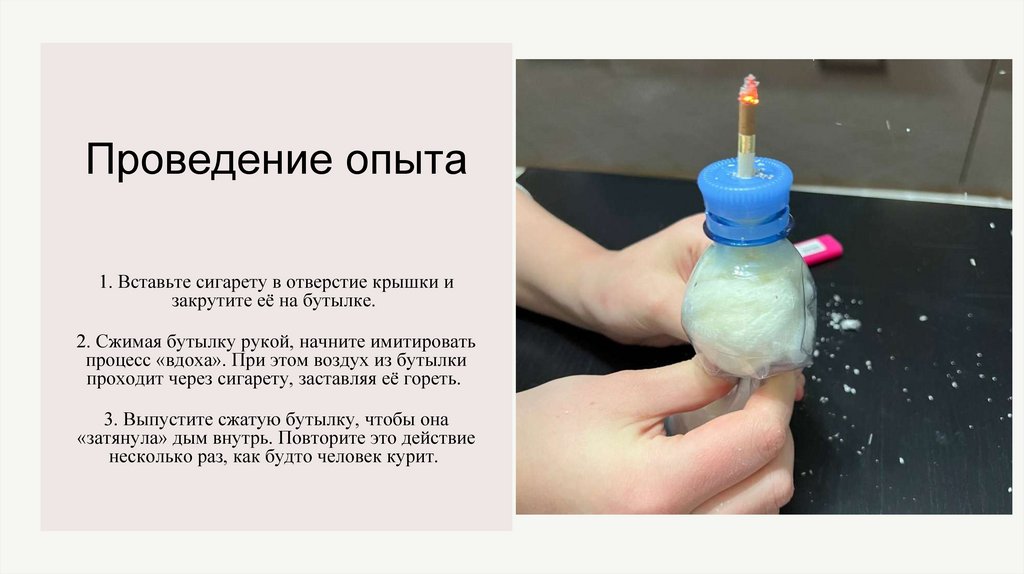 Проведение опыта1. Вставьте сигарету в отверстие крышки и
